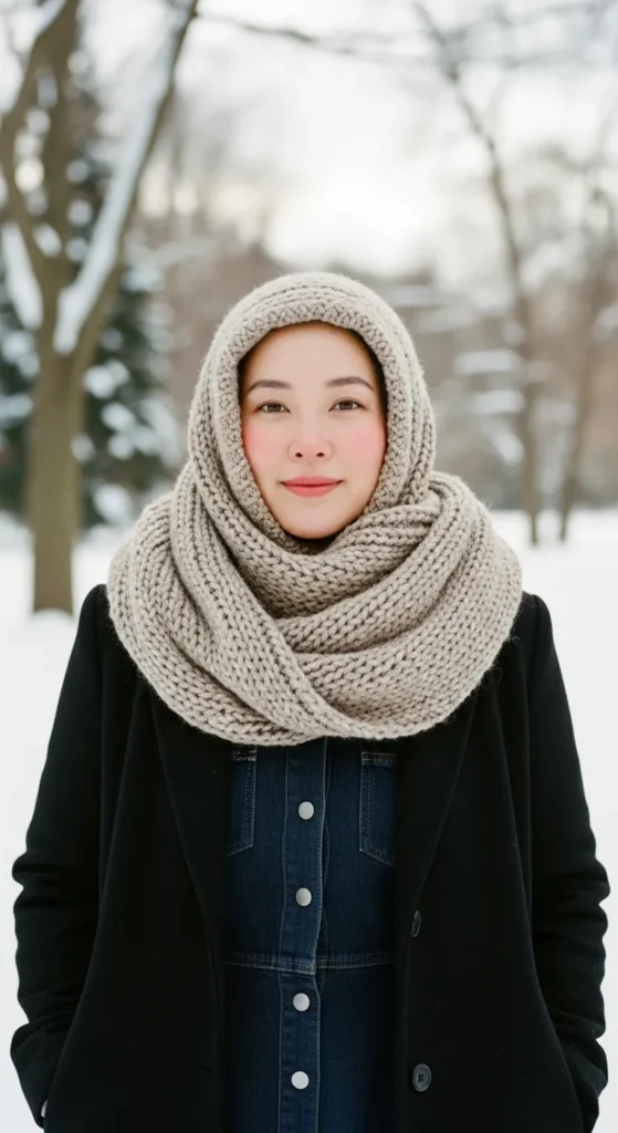 A denim dress styled with a knit scarf feels cozy and personal. It’s the kind of outfit that feels warm, familiar, and perfect for slow winter afternoons.