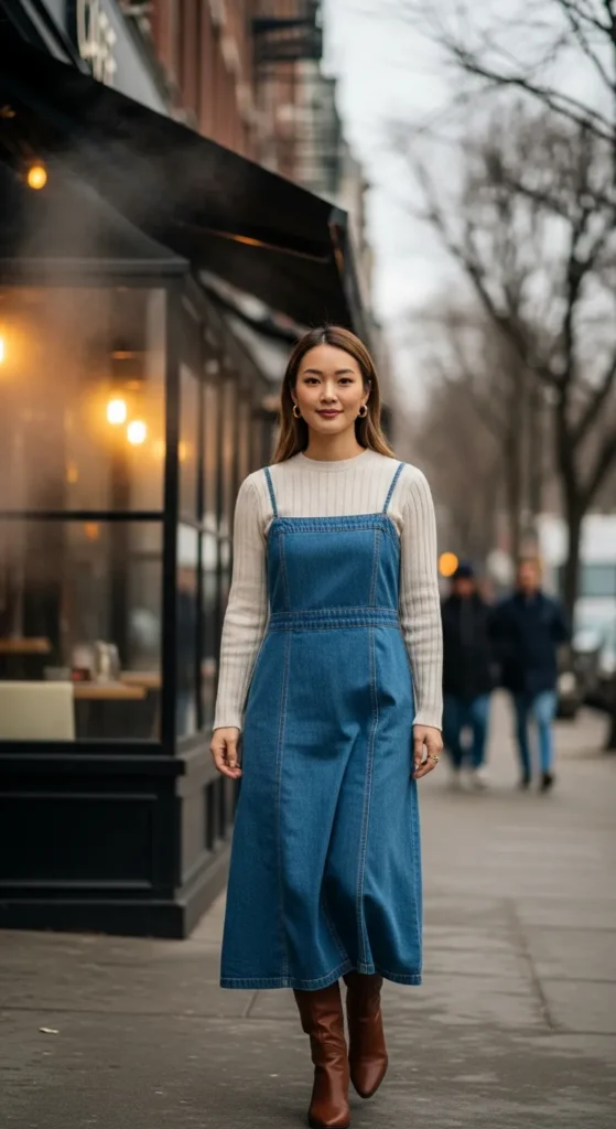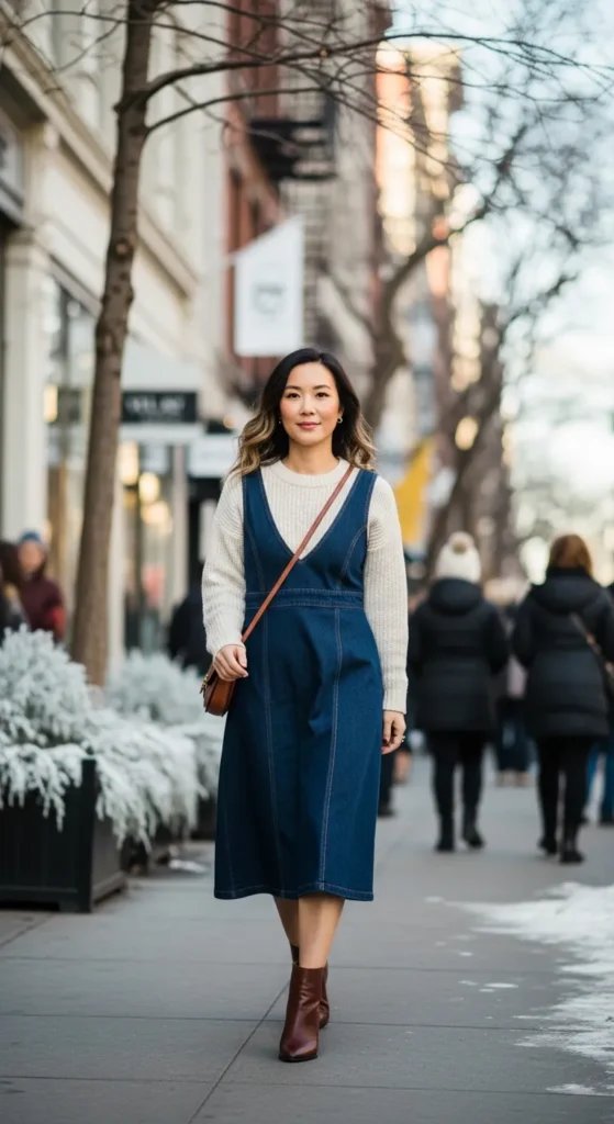 Layering a sweater over an A-line denim dress creates a skirt illusion that feels playful and cozy. This look is perfect for winter days when you want warmth without sacrificing style.
