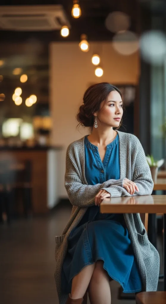 A soft cardigan layered over a denim dress creates a warm, lived-in winter look. It feels approachable, cozy, and perfect for everyday moments like study sessions or relaxed meetups.