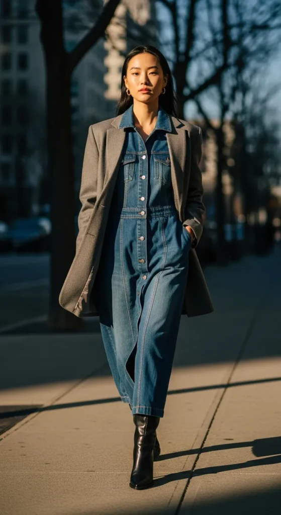 A denim dress paired with a longline blazer feels polished yet relaxed. This outfit works beautifully for casual workdays or winter meetings where you want structure without stiffness.