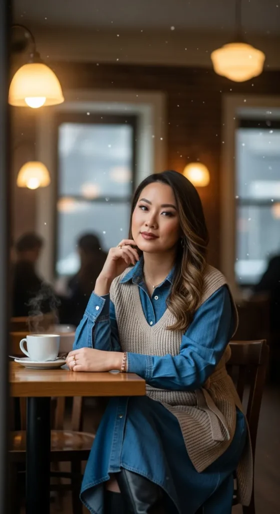 A denim shirt dress layered with a knit vest feels smart and cozy at the same time. This look blends casual structure with softness, making it ideal for relaxed workdays or casual winter lunches.