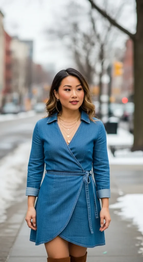 A wrap-style denim dress offers natural movement and flattering lines. It feels feminine yet grounded, making it a great winter option when you want something simple but visually interesting.