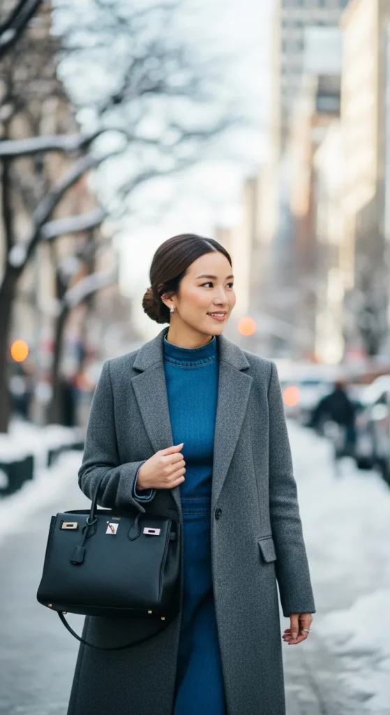 A high-neck denim dress layered with a tailored coat feels elegant and winter-appropriate. The look is simple yet refined, perfect for days when you want quiet confidence.