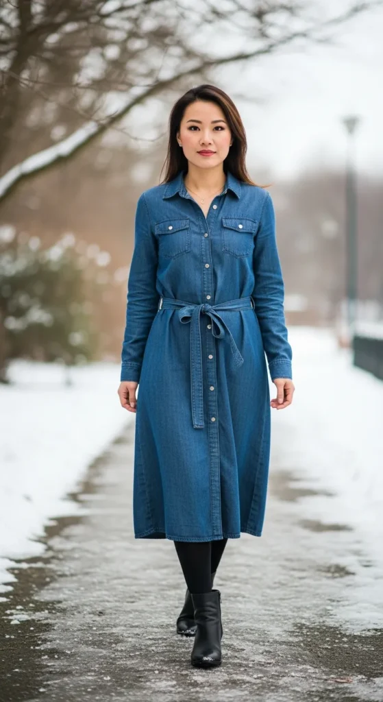 A long-sleeve denim dress paired with tights is simple, classic, and winter-ready. This outfit feels effortless yet thoughtful, perfect for days when you want easy warmth without layering too much.