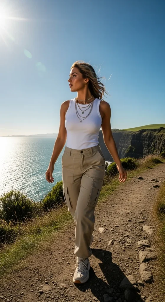 A fitted white tank paired with soft cargo pants blends utility and femininity perfectly for active coastal days.