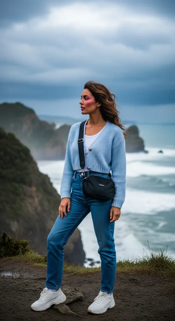 For cooler mornings, a soft cropped knit layered over a simple tank and straight-leg jeans feels cozy but polished. It’s ideal for spring breezes along coastal cliffs.