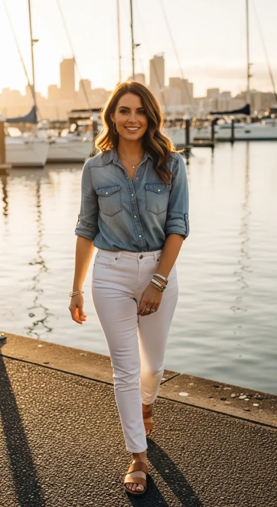 A soft chambray denim shirt paired with white jeans feels classic and light for sunny days.