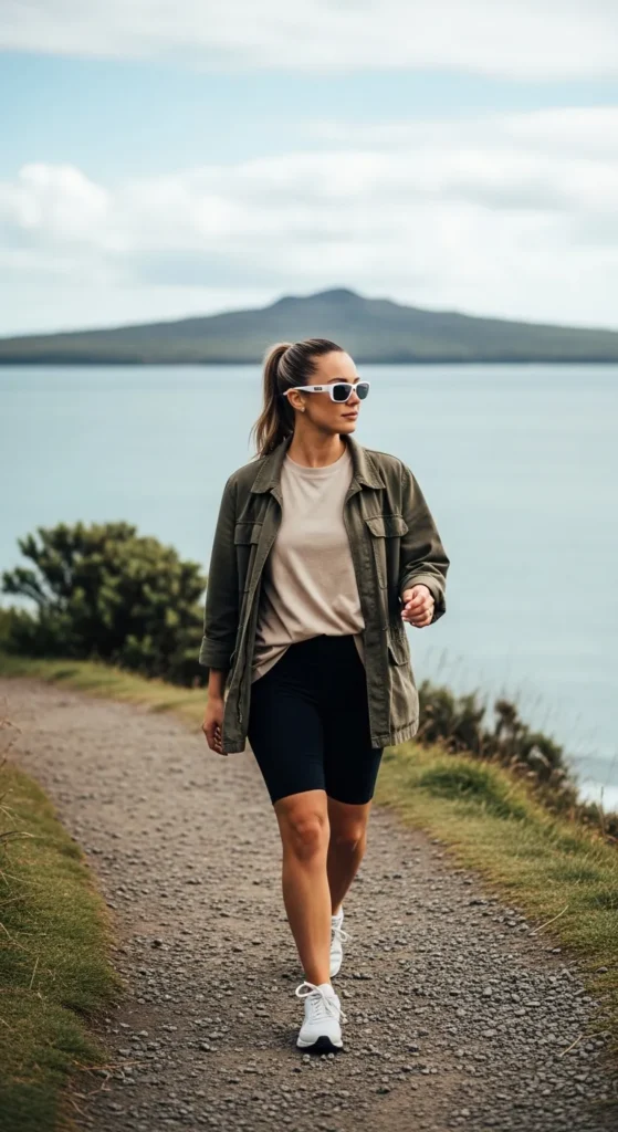 Bike shorts with an oversized tee layered under a light utility jacket create a cool, active vibe for coastal hikes or ferry hopping.