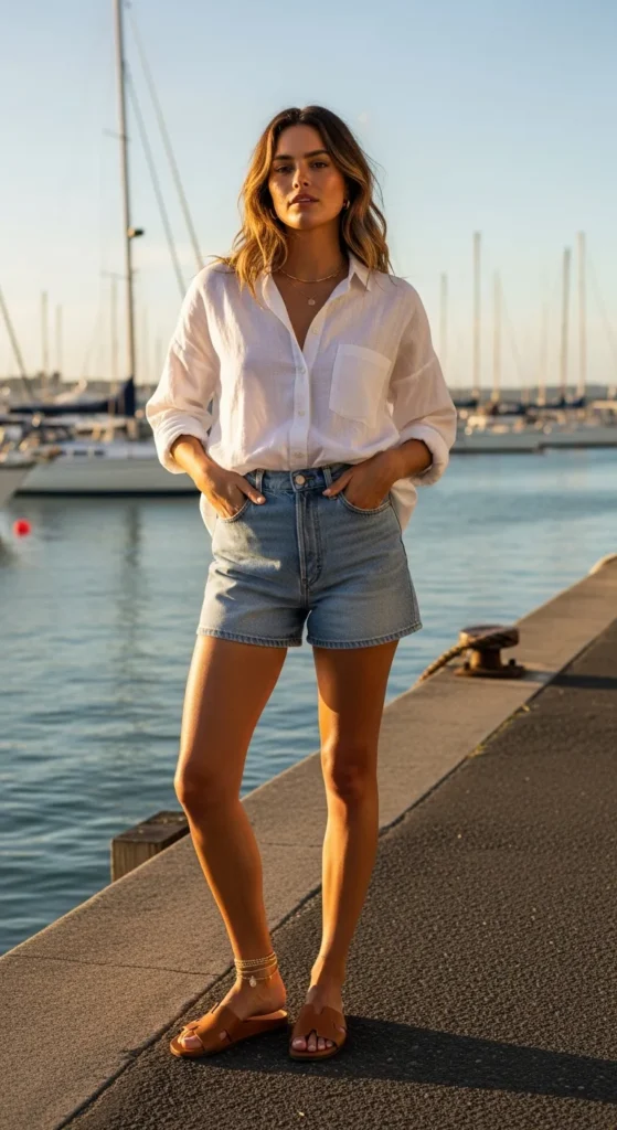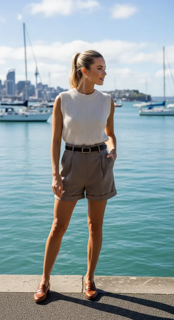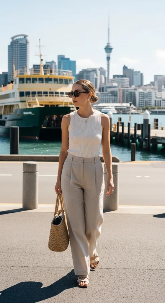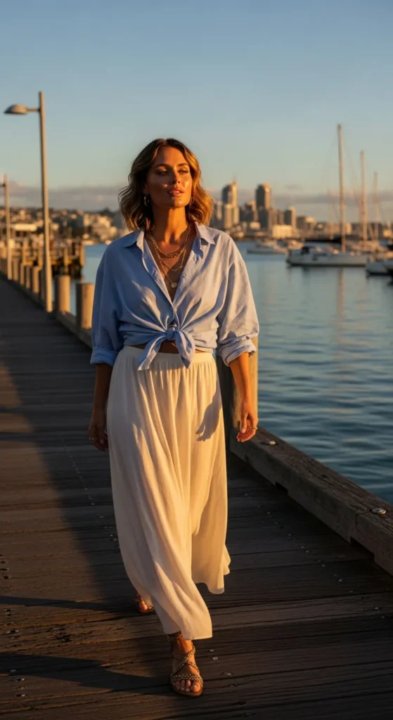 A crisp oversized linen shirt tucked loosely into high-rise denim shorts feels effortless for waterfront exploring. The breathable texture keeps you cool while the relaxed silhouette catches the breeze beautifully along Auckland’s harbor paths.