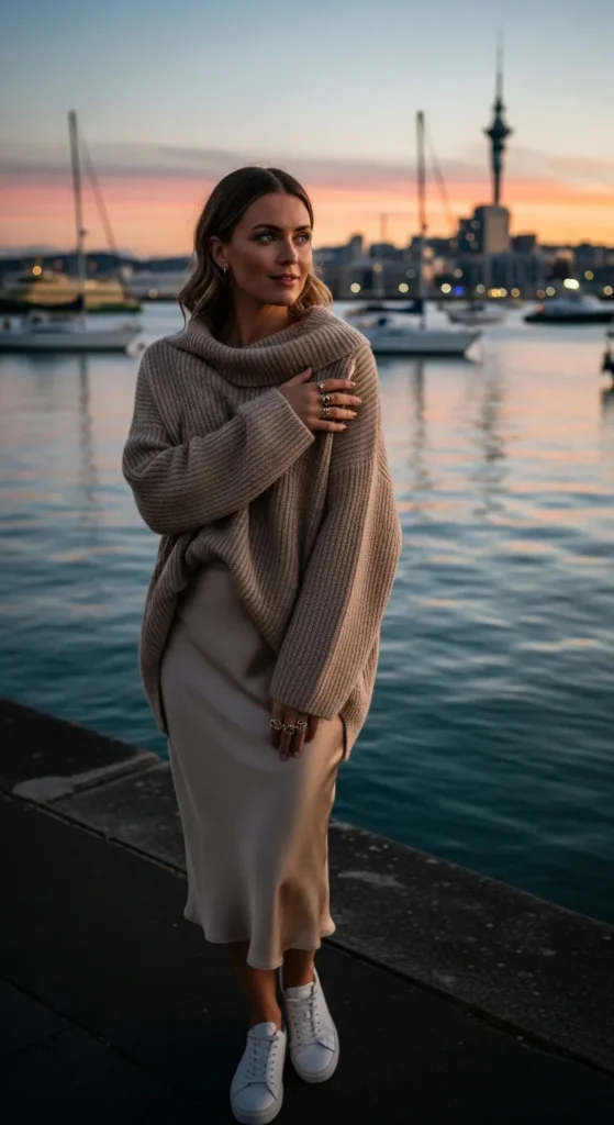 For cooler evenings, an oversized lightweight sweater over a satin slip skirt creates beautiful contrast.