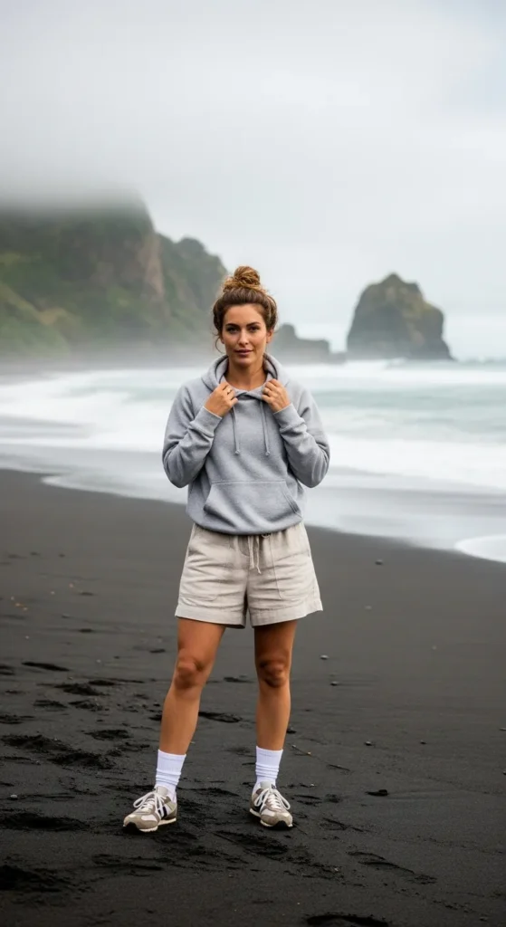 Perfect for cooler beach mornings, a soft neutral hoodie with linen shorts blends comfort and breathability.