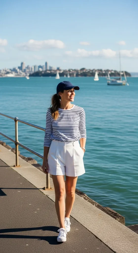 Stylist Suggestion: Add a navy baseball cap and low-profile sneakers. The cap isn’t just cute, it shields you from sun and wind while reinforcing the coastal theme.