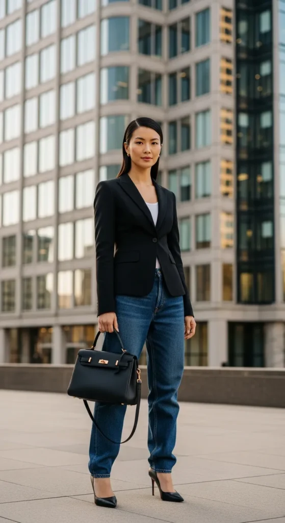 Layering a tailored blazer over a simple tank top with baggy jeans creates that perfect high-low mix. It’s relaxed but still sharp enough to feel put-together for meetings or casual workdays.