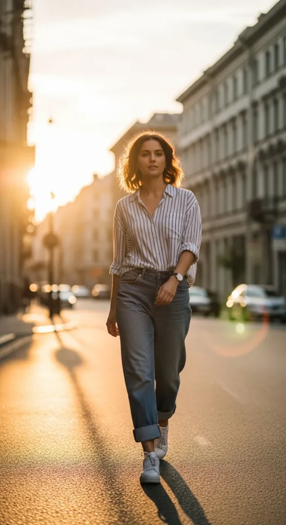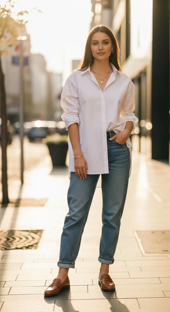 Stylist Suggestion: Pair this with gold hoop earrings and sleek loafers. The polished accessories elevate the simplicity, making the outfit feel intentional rather than basic, especially when the shirt is slightly oversized.