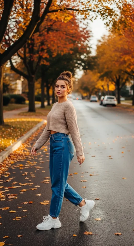 A soft cropped knit sweater with high-waisted baggy jeans creates a cozy yet flattering silhouette. It highlights your waist while still giving that relaxed, laid-back vibe that feels perfect for slow mornings or casual afternoons.