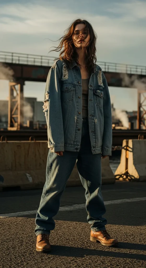Pairing baggy jeans with a denim jacket or shirt creates a bold yet cohesive look. Mixing slightly different denim washes keeps it visually interesting without feeling overwhelming.