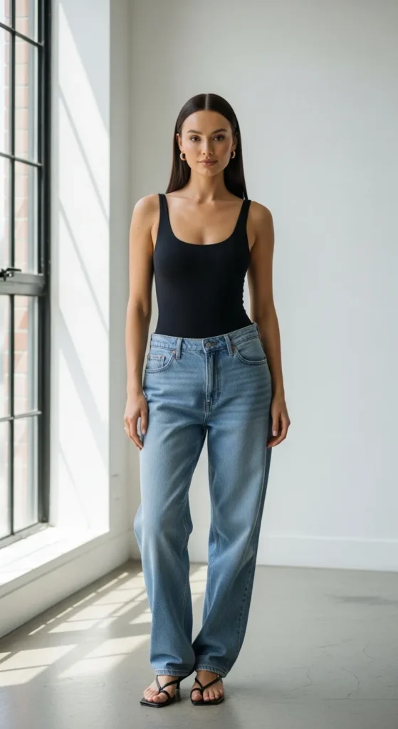 A fitted bodysuit paired with loose baggy jeans creates a flattering contrast that feels modern and clean. It hugs your shape while the jeans keep everything relaxed and breathable.