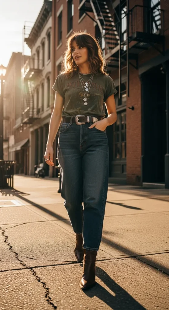 A vintage-inspired graphic tee tucked into baggy jeans instantly gives off a cool, lived-in feel. Adding a bold statement belt pulls the whole look together, making it feel styled rather than thrown on.