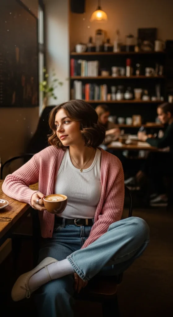 A lightweight cardigan over a simple top paired with baggy jeans feels soft, feminine, and easygoing. It’s perfect for coffee runs or quiet days when comfort is your priority.