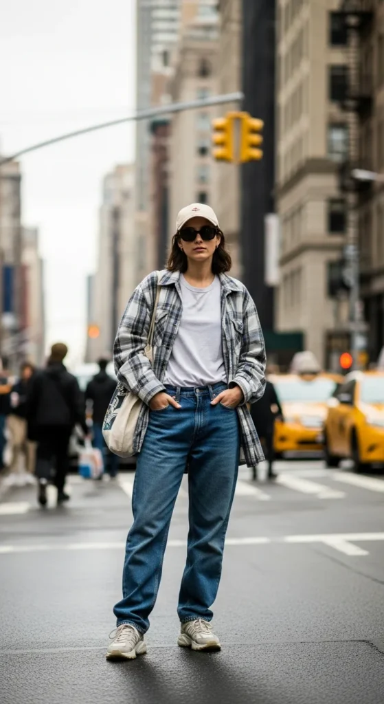 A slightly oversized button-up shirt half-tucked into baggy jeans creates an effortlessly undone look. It feels casual yet intentional, like you didn’t try too hard, but still got it right.