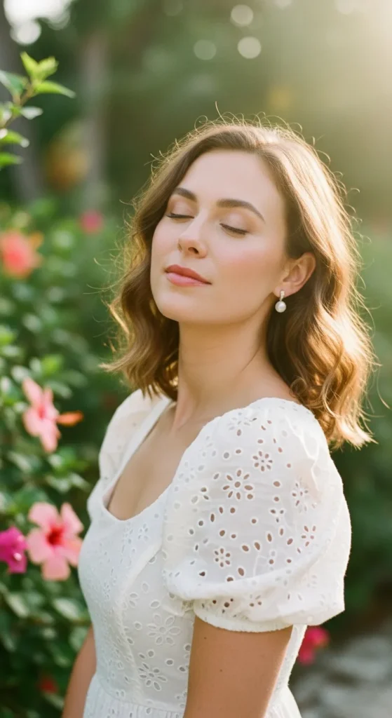 An eyelet dress with soft puff sleeves brings a touch of vintage charm while staying breathable. It feels romantic without being heavy.