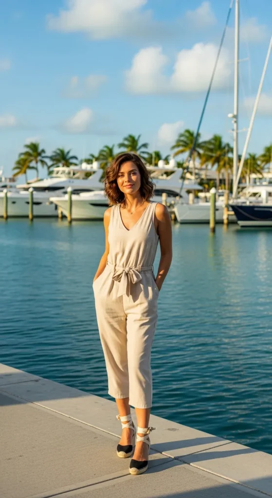 A crisp linen button-down loosely tucked into airy flowy shorts feels like instant island ease. The fabric breathes with every step, keeping you cool while still looking polished enough for a casual lunch onboard.
