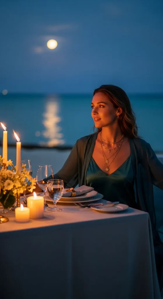 A satin slip dress layered with a light cover-up feels smooth and breezy against the skin, perfect for warm evenings by the ocean.