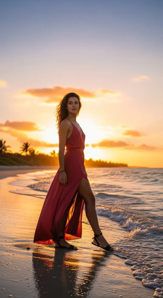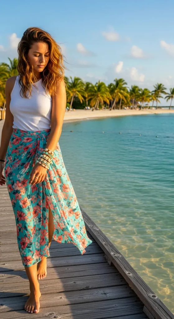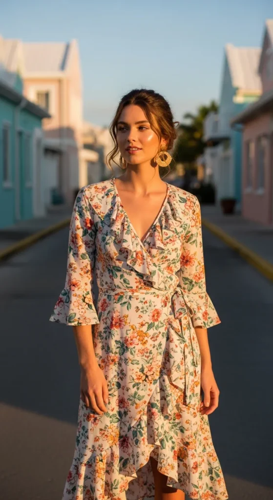 A wrap dress in a subtle tropical print hugs gently while letting the breeze play with its ruffled edges. It’s feminine, flirty, and perfect for strolling through colorful island streets.