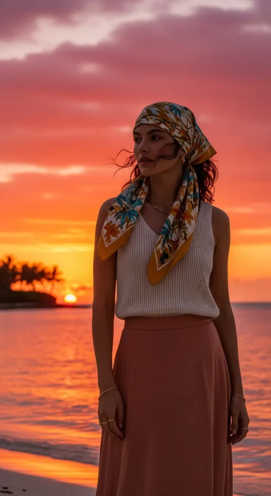 A soft knit tank tucked into a flowy midi skirt feels simple but incredibly refined. It’s ideal for a sunset dinner on the cruise deck.