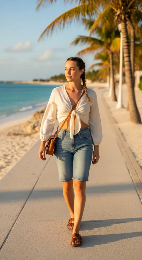 A tie-front blouse with Bermuda shorts blends playful charm and comfort for island exploration. Soft cotton fabrics enhance breathability.