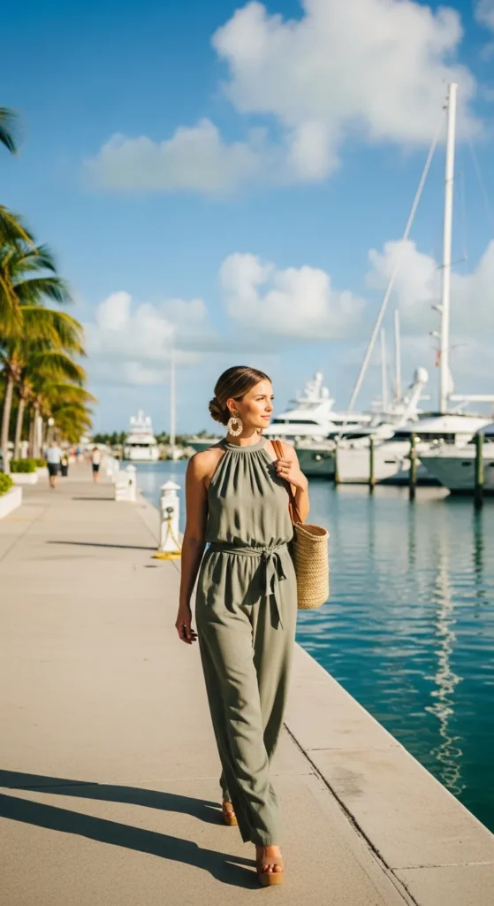 A halter neck jumpsuit in muted tropical tones offers versatility, from beach to casual dinner. Its cut elongates the figure while maintaining breezy comfort.