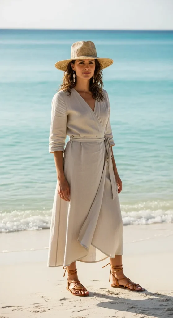 A soft linen wrap dress in sand tones paired with a wide straw hat brings effortless elegance to beach strolls. Its airy design keeps you cool while exuding vacation ease.