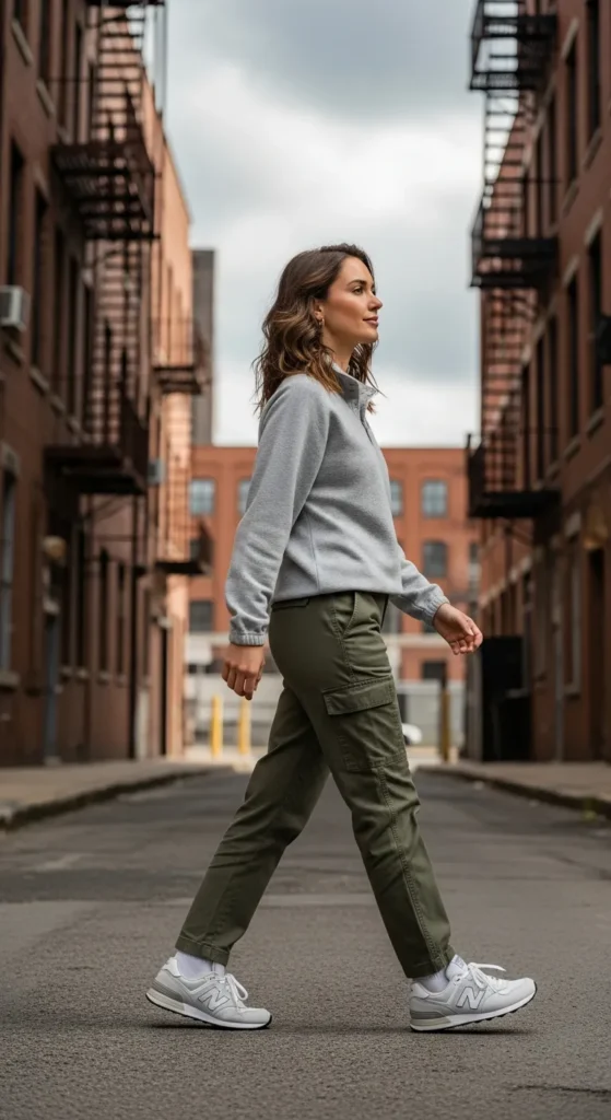 A lightweight pullover and cargo pants create a casual, functional outfit. New Balance sneakers enhance the sporty edge, making this look perfect for busy days that require movement and comfort.