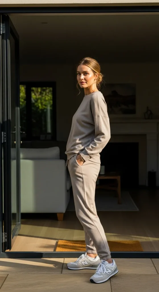 A matching lounge set styled with New Balance sneakers feels intentional and polished. It’s an easy outfit that looks styled without effort, perfect for casual days out.