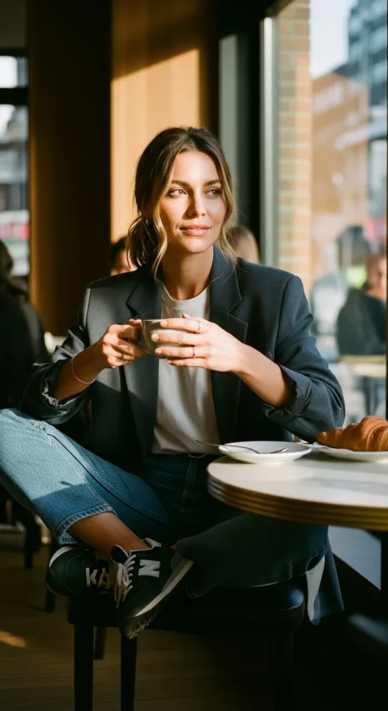 A relaxed blazer layered over casual basics instantly elevates the look. New Balance sneakers keep it grounded, making the outfit perfect for casual workdays or coffee meetings.
