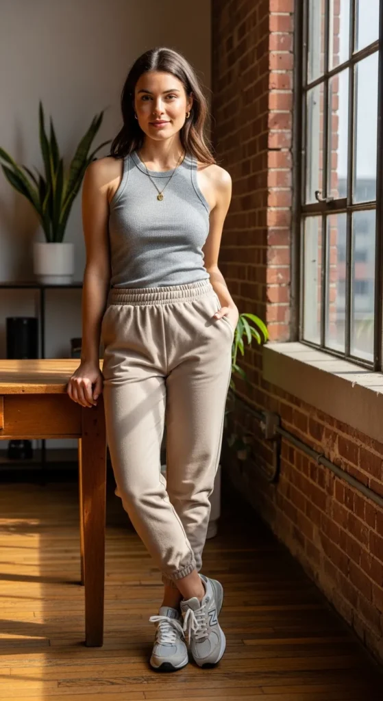 A ribbed tank and relaxed joggers strike the perfect everyday balance. New Balance sneakers bring structure to the softness, creating a look that feels breathable, practical, and stylish enough for errands or casual afternoons.