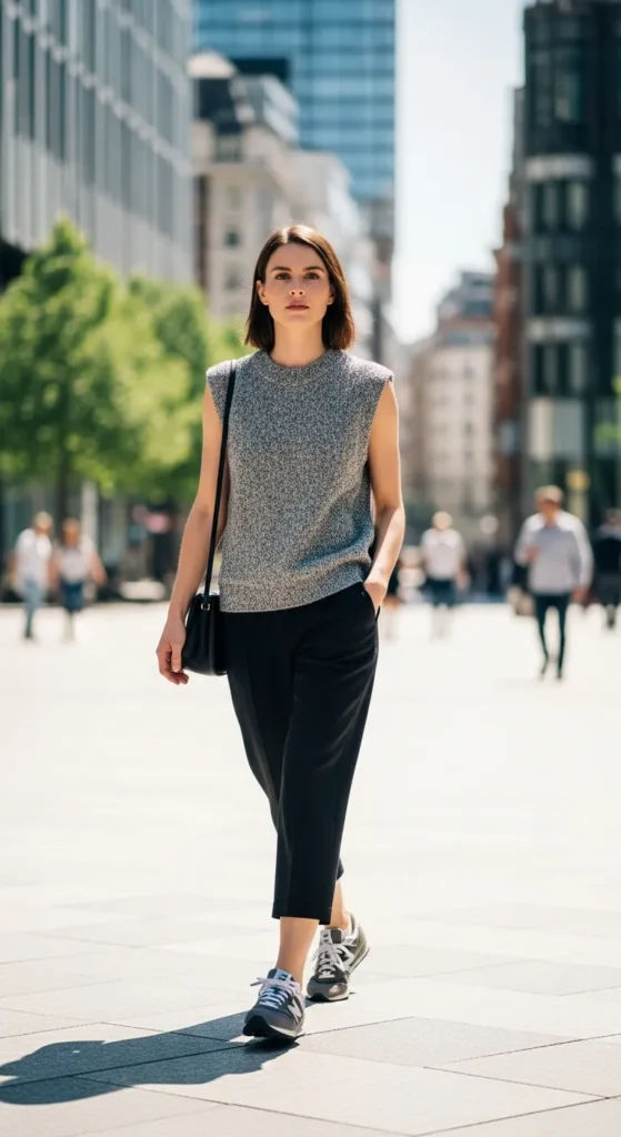 A sleeveless top paired with cropped pants feels light and modern. New Balance sneakers add everyday practicality, making this outfit ideal for casual movement-filled days.