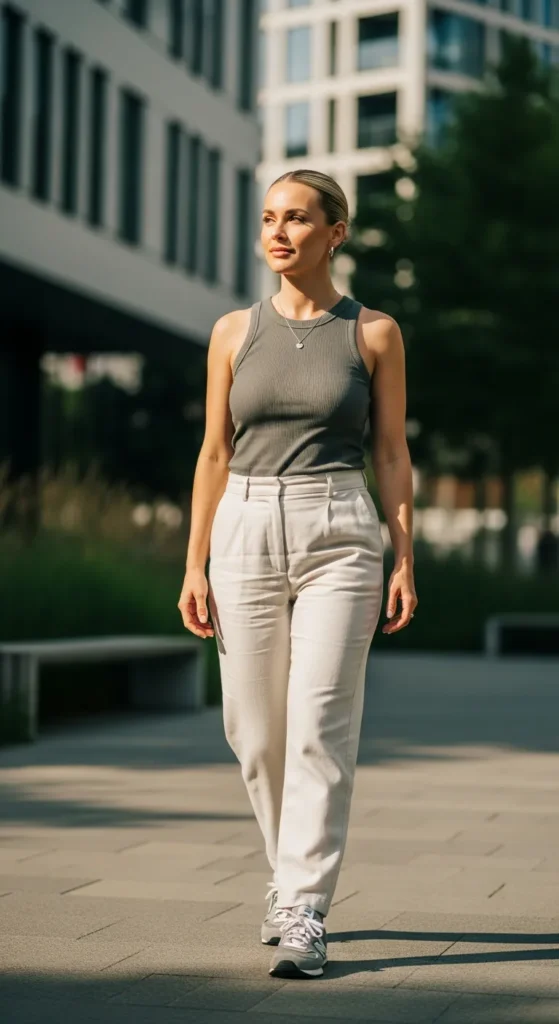 A simple tank top paired with linen trousers feels breathable and refined. New Balance sneakers add a sporty contrast, making the outfit perfect for warm days that still call for polish.