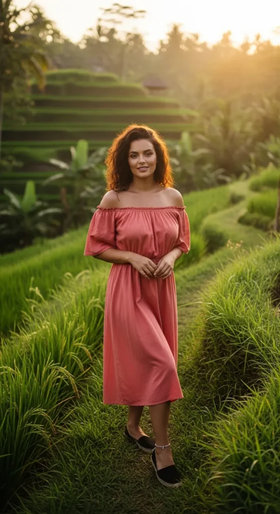 Stylist Suggestion: Style with flat espadrilles and a delicate anklet. Exposed shoulders and subtle accessories keep the look feminine and light, ideal for Bali’s warm, breezy climate.