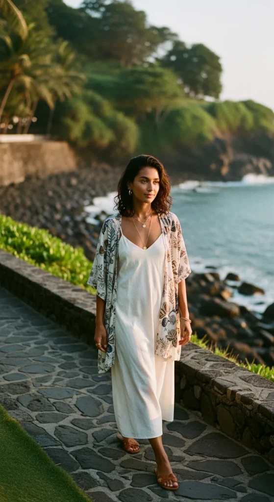 A cotton slip dress layered with a light kimono gives versatility. It transitions easily from daytime exploring to evening dinners while offering coverage when needed.
