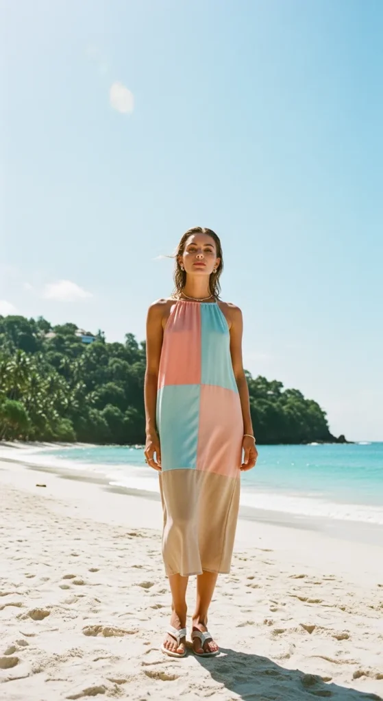 A lightweight halter dress keeps shoulders open and cool. It’s flattering, simple, and perfect for sunny beachside afternoons.