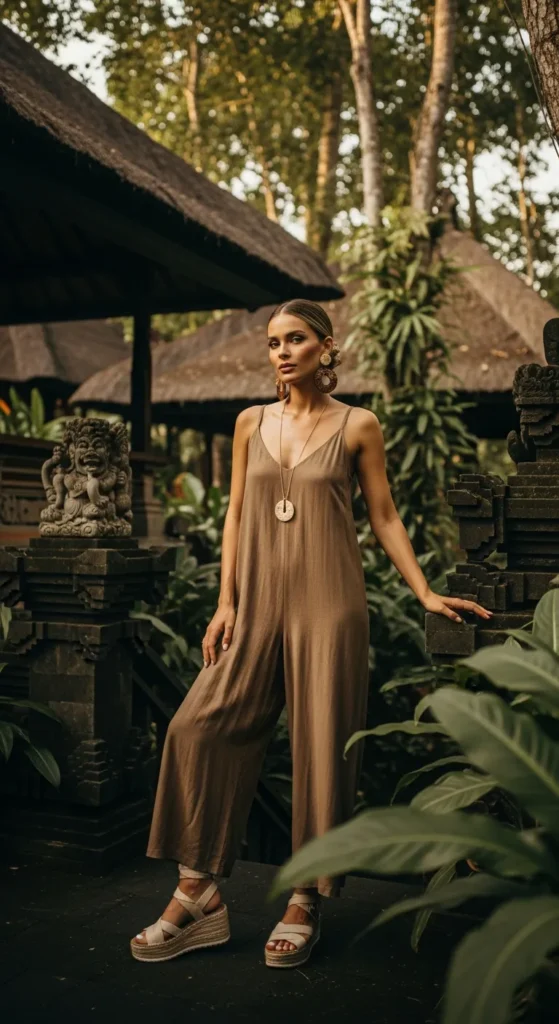 A loose-fitting jumpsuit offers an all-in-one solution for busy travel days. Earthy tones feel grounded and sophisticated while keeping the outfit practical for heat and movement.