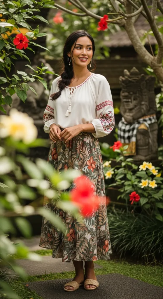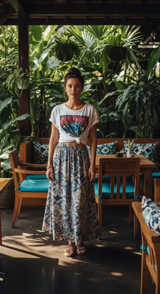 A casual graphic tee tucked into a flowing skirt blends comfort with personality. It feels youthful and perfect for laid-back Bali days.
