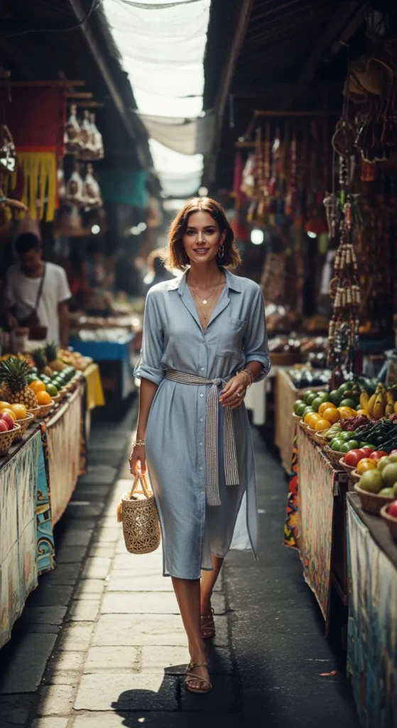 A chambray dress offers structure without heaviness. It’s breathable enough for Bali’s warmth while looking polished for casual dinners or exploring towns.