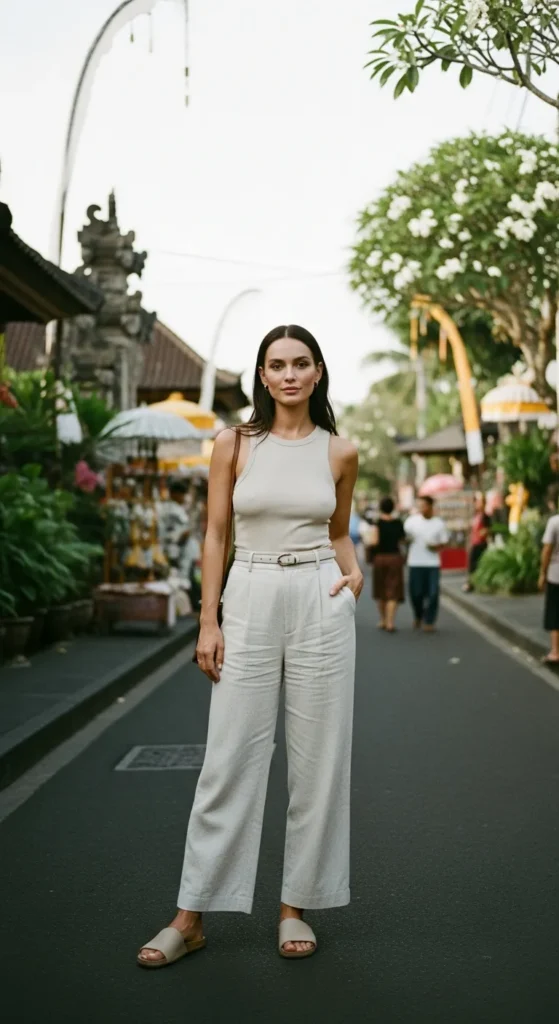Stylist Suggestion: Add woven slide sandals and a structured straw bag. The contrast between soft linen and textured accessories elevates the outfit while keeping it grounded in Bali’s relaxed aesthetic.
