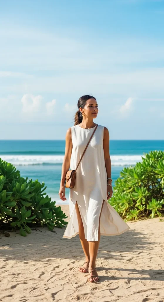 A sleeveless linen dress with side slits offers breathability and movement. It’s perfect for warm afternoons when you want something easy yet stylish.