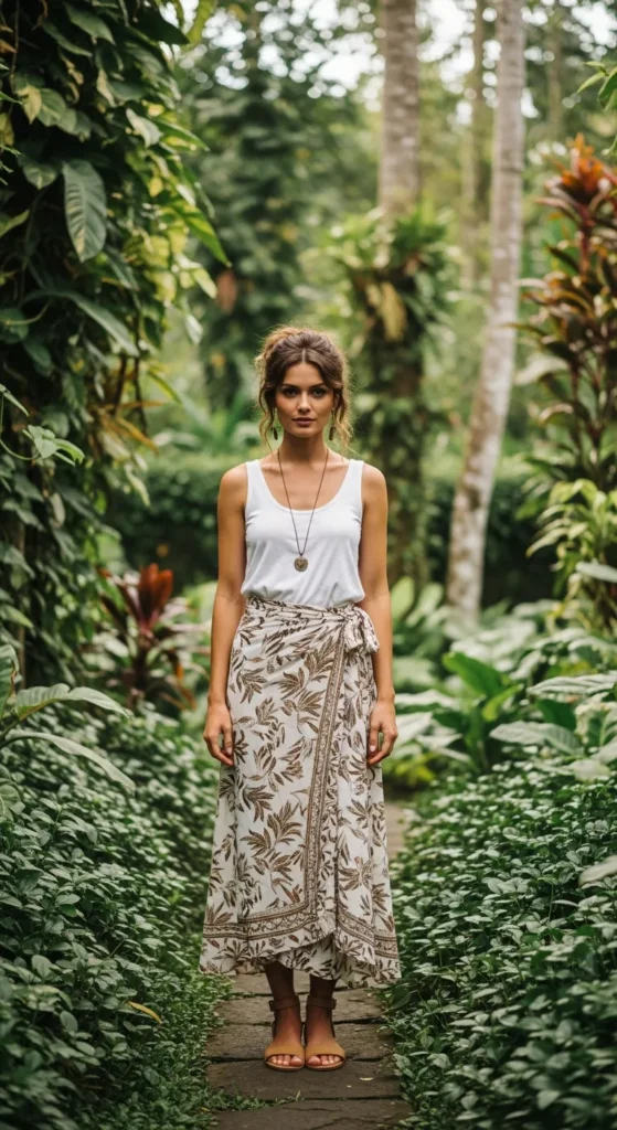 A wrap skirt paired with a breathable cotton tank creates an easy silhouette that adjusts to the heat. It feels casual yet intentional, ideal for wandering through Ubud or enjoying a slow lunch.