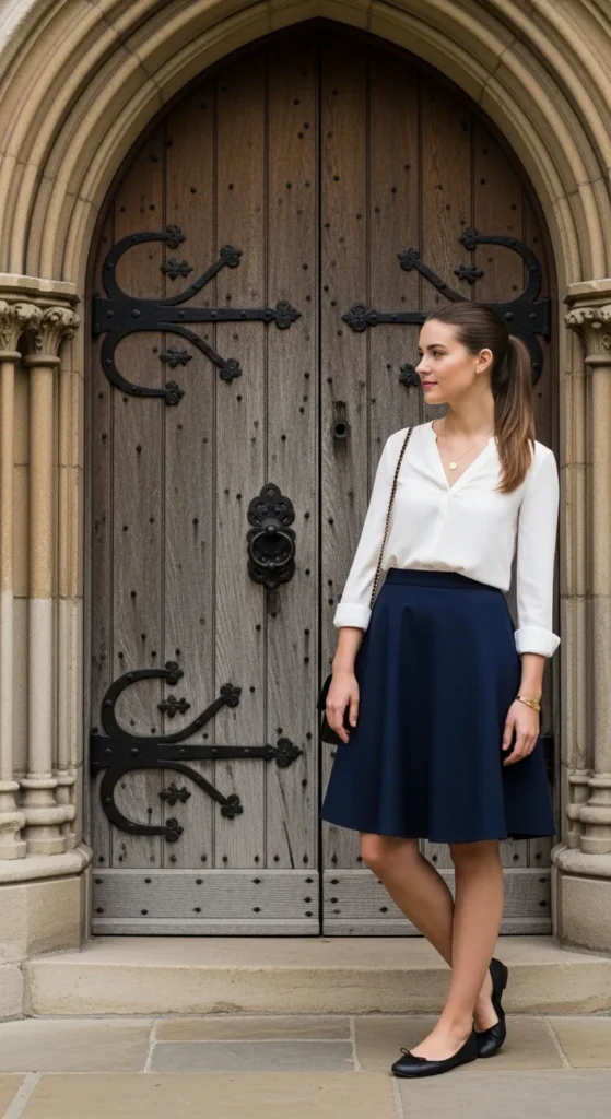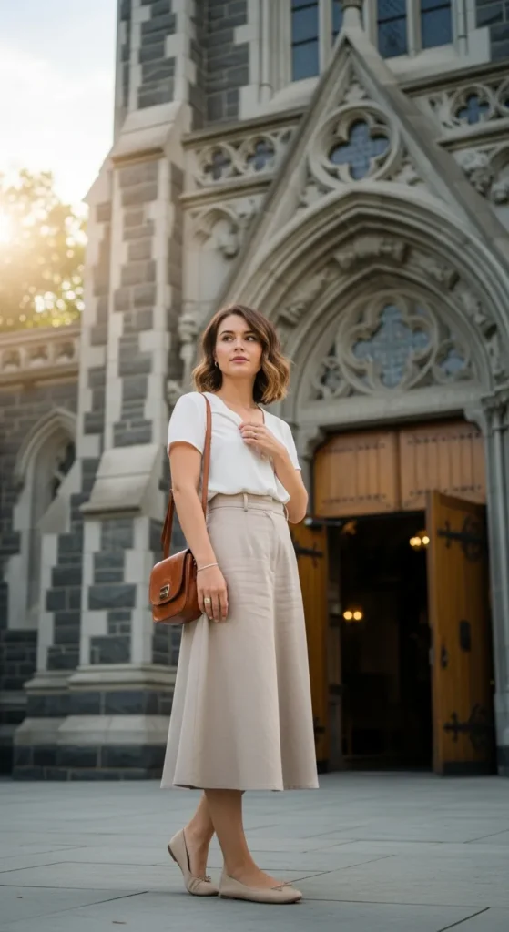 A structured A-line skirt paired with a crisp button-up blouse offers a polished, modest outfit ideal for church. Ballet flats soften the structure, giving the look a balanced, wearable charm.