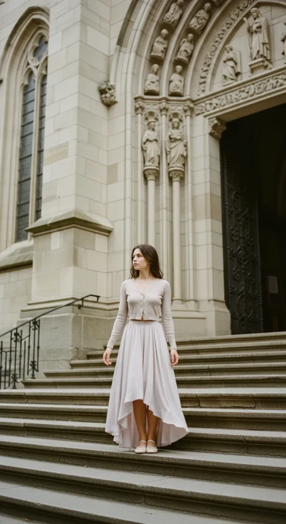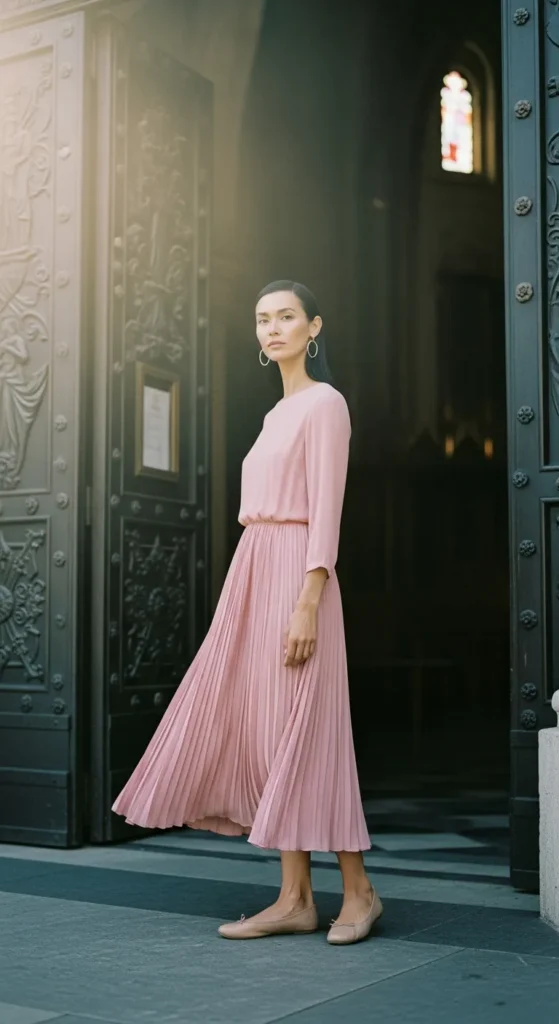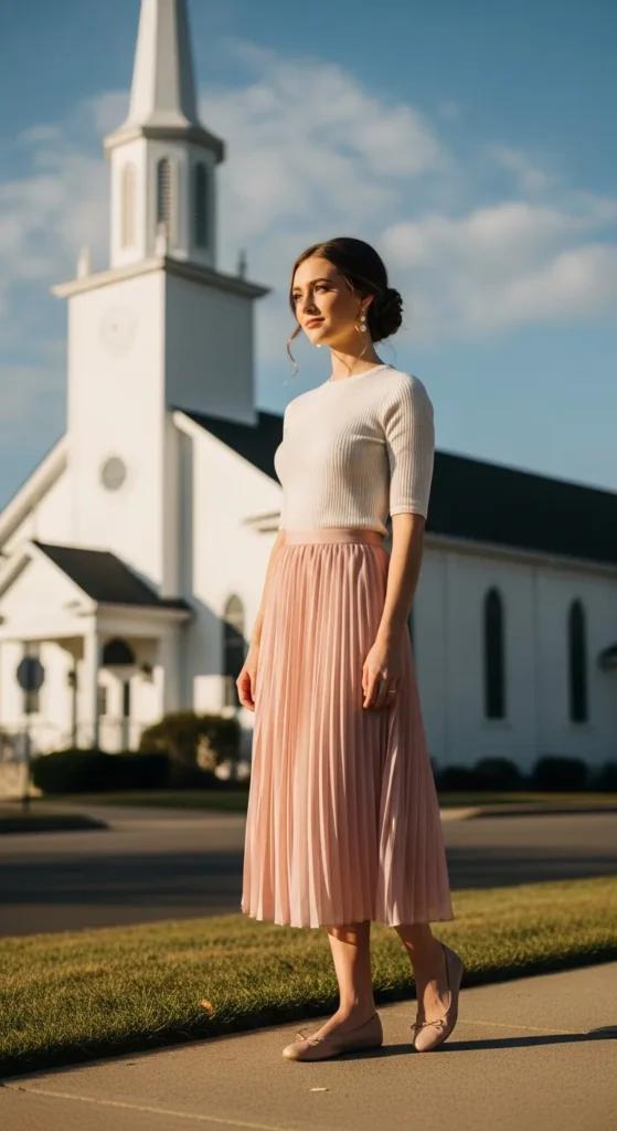 A flowy pleated midi skirt paired with a fitted knit top creates a gentle, graceful silhouette perfect for Sunday service. Ballet flats complete the look with quiet elegance, keeping everything soft, feminine, and comfortable.