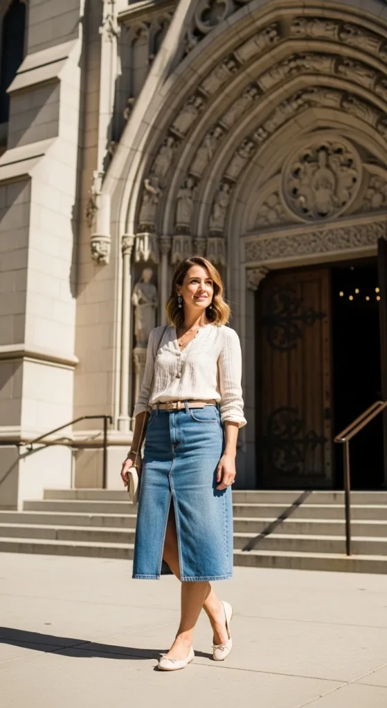 A denim midi skirt paired with a soft blouse feels relatable yet refined. Ballet flats soften the casual element, making it church-appropriate.